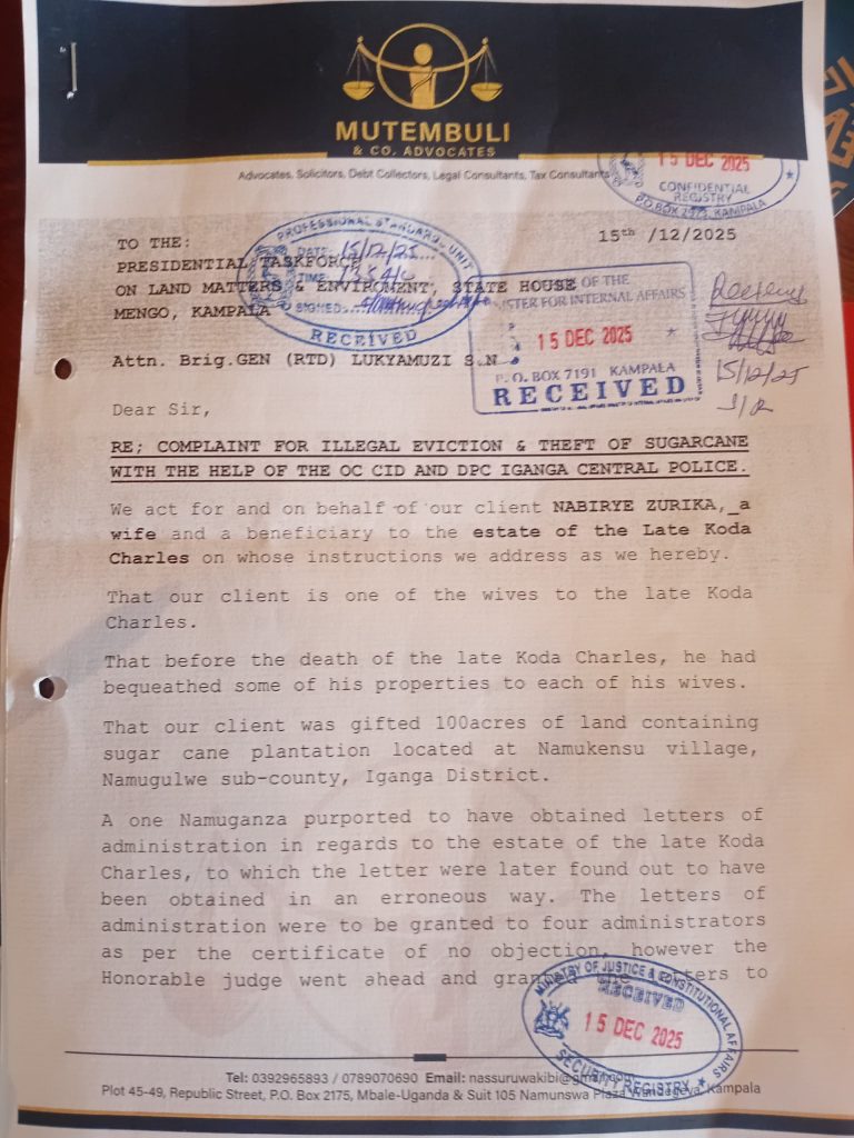 “From 6th December 2025 up to date, the DPC and OC CID have sent police patrol vehicle Registration number UP 7000696 backed by security personnel and some local authorities to protect Namuganza while harvesting sugar cane well aware that the same does not belong to the estates of late Koda since he gifted it to our client”, the letter read in parts.